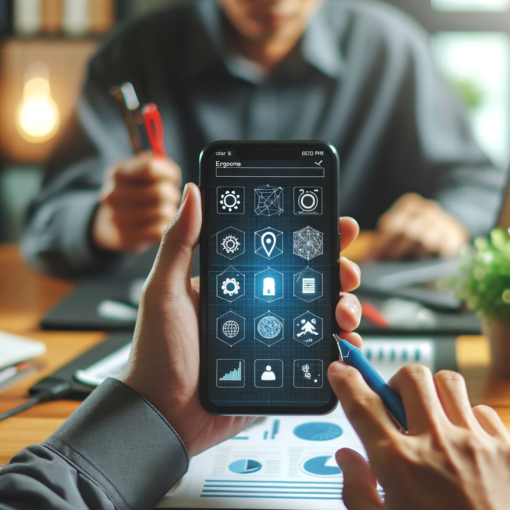 A mobile app development in progress, with a focus on the application interface on a smartphone held by a developer.